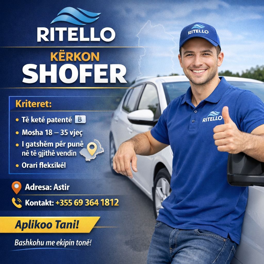 RITELLO KËRKON -SHOFER Kriteret: * Te kete patenté * Mosha 18 - 35 vjeg * I gatshẽm per pune nẽ te gjithe vendin * Orari fleksikel 📌Adresa: Astir 📞Kontakt: +355 69 364 1812 Aplikoo Tani! Bashkohu me ekipin tone!